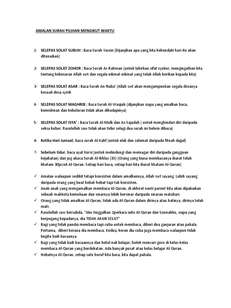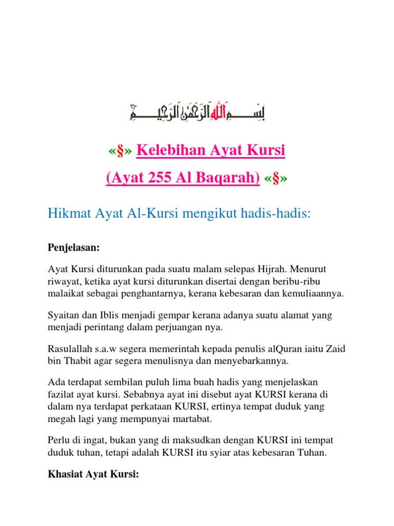 Sesiapa membacanya ketika dalam kesempitan nescaya allah azza. Mmg jd amalan ayat kursi nih. Sejarah ayat kursi, khasiat ayat kursi, manfaat ayat kursi, amalan ayat kursi, pahala ayat kursi, cara mengamalkan ayat kursi. Sedutan kuliah maghrib kitab 50 hadith fadhilat amalan oleh ustaz jafri abu bakar di masjid abdullah fahim, kepala batas, pulau pinang pada 21 januari 2016. Membacanya dapat menghilangkan rasa marah, dijauhi bala bencana dan gangguan syaitan. Barang siapa yang membaca ayat kursi setiap kali selesai dari solat fardu, maka tidak ada perkara yang akan menghalangnya untuk masuk ke syurga melainkan kematian. Menurut abu umamah r.a, rasulullah s.a.w telah bersabda: Umatku yang membaca ayat kursi 12 kali pada pagi jumaat, kemudian berwuduk dan sembahyang sunat dua rakaat, allah memeliharanya. *ia bermaksud bahawa amalan ini akan memudahkan masuk ke syurga selepas mati. Barangsiapa yang membaca ayat kursi setiap kali selesai dari solat fardu, maka tidak ada perkara. اللَّهُ لَا إِلَهَ إِلَّا هُوَ الْحَيُّ الْقَيُّومُ لَا تَأْخُذُهُ سِنَةٌ وَلَا نَوْمٌ لَهُ مَا فِي السَّمَاوَاتِ وَمَا فِي الْأَرْضِ مَنْ kursi allah meliputi langit dan bumi. Tujuan nya adalah amalan ini, di antara amalan yang lain, sebagai pengiring doa untuk di lepaskan saya dalam masalah. Orang yang selalu membaca ayat kursi dicintai dan dipelihara allah sebagaimana dia memelihara nabi muhammad saw.