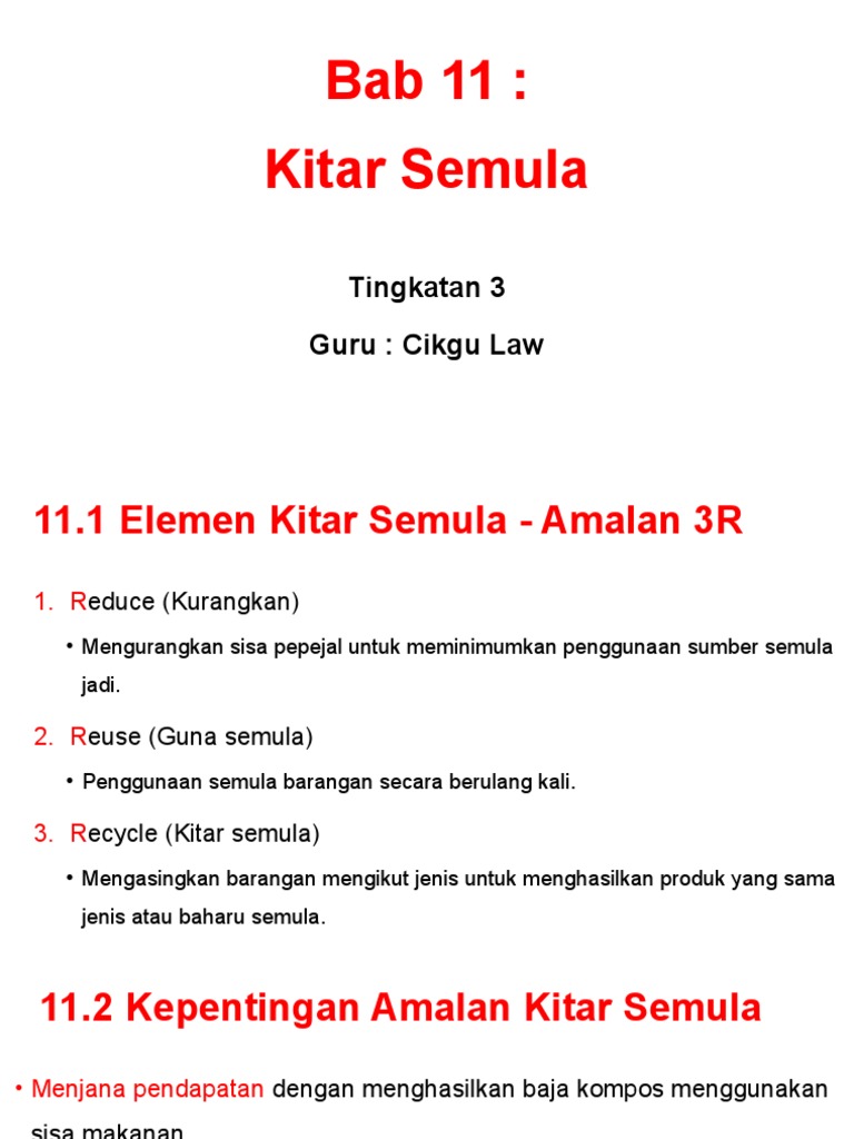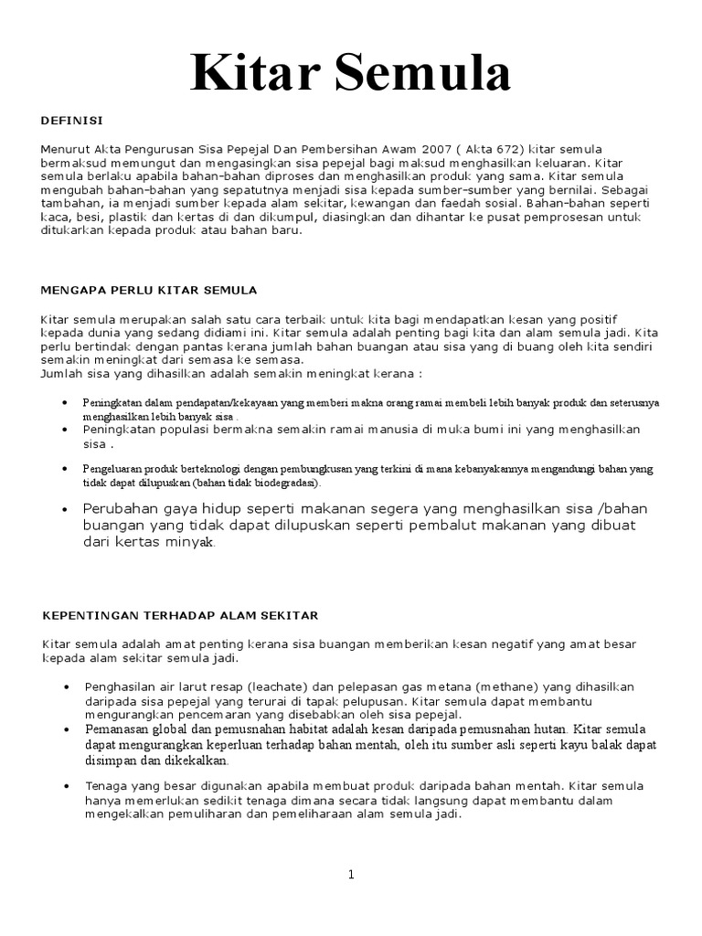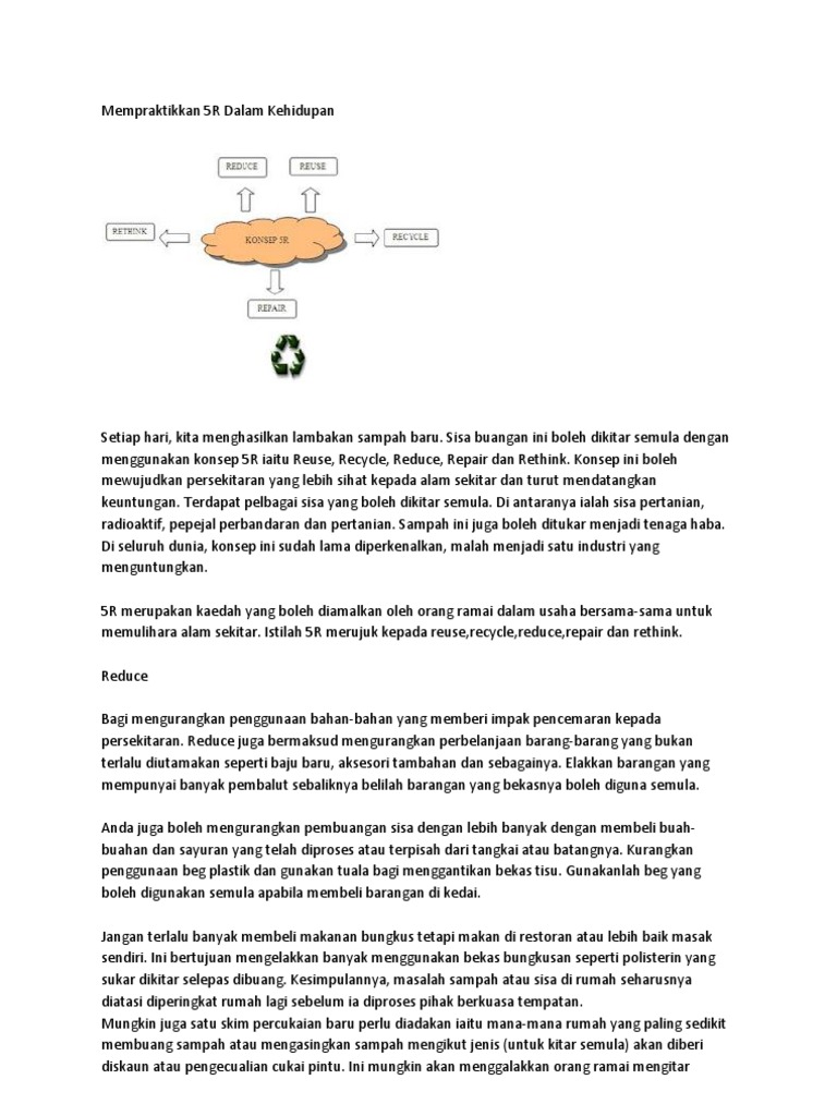 Pengetahuan dan amalan hijau dalam kalangan murid sekolah rendah 43 dan amalan reuse, reduce, recycle (3r). Sasaran kita sahaja jauh jika dibandingkan dengan negara maju seperti jepun yang berjaya melakukan kitar semula melebihi 50 peratus. 2.3.4 menjana idea untuk meningkatkan amalan 3r. Kitar semula merupakan salah satu cara terbaik untuk kita bagi mendapatkan kesan yang positif kepada dunia yang sedang didiami ini. Menyatakan kesan pertambahan sisa pepejal. Amalan kitar semula memberi keuntungan kepada rakyat sekiranya dilakukan secara kolektif. Other sets by this creator. Guna semula (reuse) menggunakan semula bekas minuman, surat khabar, majalah atau mendermakan bukubuku dan pakaian. Image.slidesharecdn.com semasa tempoh sumber kurang, kajian arkheologi bagi sampah silam menunjukkan kurang buangan rumah (seperti abu, perkakasan rosak, dan tembikar. Sebagai contoh, jumlah minyak adalah terhad dimana daripadanya kita boleh buat plastik dan bijih aluminium bagi membuat tin minuman. Sudahlah kesedaran amalan kitar semula gagal. Menceritakan cara sisa pepejal diuruskan. Sekumpulan pelajar alfa kolej telah merealisasikan amanat ini kepada diri mereka serta penduduk pulau ketam.